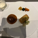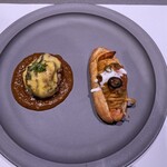 「ゲストシェフプレート」では、有名シェフとコラボしたプレートに出会えます。現在は、パリで高い注目を集めている一軒家のレストラン「MAISON」のオーナー・シェフで、フランス料理の新時代を築くとも言われている新進気鋭のシェフ・渥美創太氏プロデュースの一皿を提供。レバーとカリカリになるまで焼いた皮で食感と風味にアクセントを加えた鴨肉のハンバーグと、エシャロットやハーブの風味豊かなタルタルソースを味わうカキフライが楽しめます。
