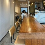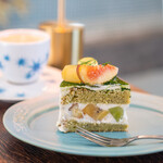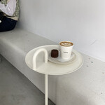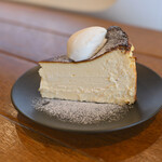 トロトロ系の桜バスクチーズケーキ。中心のトロトロ部分は桜を、外側はチーズ感を楽しめます。今回は美しいラテアートの抹茶ラテと合わせていただきました。