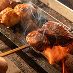 おまかせコースは6,200円ですが、さらに3,300円で焼き物4本のショートコースも。もちろん、後からアラカルトで好きな串を追加することができます。最初に頼んだ生ビールがおいしくて、これはいい店だと確信しましたが、焼鳥も高レベルでした。串によっては、炭火だけでなく薪火で香りづけも。骨を抜いた手羽先はジューシーだし、みそ漬けカマンベールの串はお酒にぴったり。