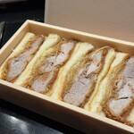 看板メニューの「特製カツサンド」2,300円は、ジューシーでボリューム満点で、4切れ入って総重量はなんと400g以上あるそうです。厚み2cm近くあるカツはしっとりとしてやわらか。焼いたパンにソースの染みたカツと、新鮮でみずみずしいキャベツ、その一体感に食べた人は思わず笑顔に。出来立てはもちろん、時間を置いても味が染みて格別のおいしさですよ。