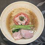 おすすめは、全国的にも珍しい渡り蟹の出汁の淡麗スープ「淡麗蟹そば」900円。渡り蟹を沸騰させないよう弱火でじっくり炊くことで香りと旨みを抽出した淡麗スープです。チャーシュー2枚、空芯菜、大葉、炙りトマト、蟹のほぐし身がのり、見た目も美しい一杯。しなやかな平打ち中太麺がスープによく絡み、蟹の香りと旨みを存分に堪能できます。炙りトマトの上にのった蟹のほぐし身をスープに混ぜながら、味わってみてください。食べた方からは「上品で身体に染み渡るようなラーメンを、この価格で味わえるのはすごい!」と、喜びの声が聞かれています。
