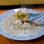 米料理であると共に、卵料理でもあるオムライス。こちらのオムライスは1人前に卵を4〜5個分使っており、どの角度からスプーンを入れても必ず卵とケチャップライスを一緒に楽しめます。さらに、オムライスを頼むと無料で「ラーメン」か「ワンタン」か「スープ」が選べるドカ盛りハイコスパ町中華!