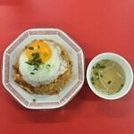 中は普通の炒飯、上にはふわっとろのオムレツ、上にはチャーシューの厚切りがモリモリと。ケチャップをかけるので上はまるでオムライスのような味わい、中はラードがきいた中華味の炒飯……と二刀流で楽しめる一皿です。