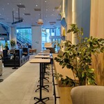 店内はアイボリーやグレーを基調とした、木の温もりを感じる落ち着いた雰囲気。天井が高く開放感のある空間には、一人でも立ち寄りやすいカウンター席や、ゆったりと会話を楽しめるテーブル席があり、客席は全79席です。