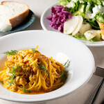 マーブルのコンセプトは「ニューレトロ」。ボンゴレビアンコやペンネアラビアータなど昔からある人気メニューに加え、発酵調味料や珍しいパスタを使ったメニューも取り入れ、懐かしさと新しさのある一皿が一度に楽しめる。スタッフは姉妹店の池尻大橋「ルリイロ」、自由が丘「ニショク」で腕を振るっていた松田香菜さんがシェフを務め、サービスの安原亜美さんがワイン選びをサポートしてくれる。女性スタッフを中心とした明るく親しみやすい雰囲気の店内になっている。