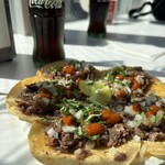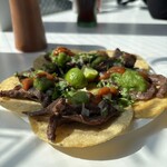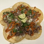 幸いというべきか、こちらはまだ穴場状態。強くトウモロコシを感じる直径10センチほどの5枚のトルティーヤの上にどっさりと牛肉や豚肉のコンフィ、玉ねぎ、パクチーがのり、サルサがかかっています。これにライムをギュッと搾り、手がベトベトになることなどお構いなく、立ったまま齧り付く。肉の豊かな食感と、強い辛み、さわやかな酸味がたまりません。