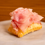 シェフが生ハムを熱々のトルタフリッタに乗せて食べるのがオススメとのことで、