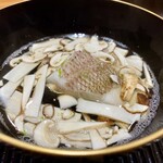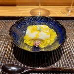 お椀代わりに供されたのは、京都・上賀茂の農家が育てた賀茂なすと、希少な白甘鯛を組み合わせた一品。賀茂なすは身がしっかり詰まり、やわらかくもみずみずしい。白甘鯛は、久保さんが信頼を寄せる愛媛の漁師・藤本純一さんよる神経締めで、繊細な旨みが際立っている。