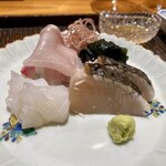 真鯵は江の島沖で朝とれたものが昼には届くという抜群の鮮度だ。臭みなども一切なく、甘みや香りが良い鯵を刺身で和え物にしている。「この食感や味わいは当日水揚げされた鯵にしか出せないものです」と久保さん。美しいガラスの器は大正時代から続く江戸切子で、梶の葉を敷いた設えも爽やかだ。