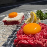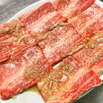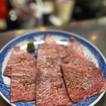 焼肉業界の次世代を担う店でオーダー必須の肉ばくだん。手切りのユッケ、ひきわり納豆に卵黄やたくあん、紫蘇などをよく混ぜ海苔にのせて食べれば、ビールがどんどん進みます。とろけるような肉の甘みと納豆のねばり気がベストマッチな完全栄養食!