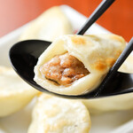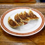 「ホワイト餃子」の暖簾分け店。厚めの俵形、揚げ焼きにした皮はまるで香ばしいパンのよう。ラードのうまみをまとったパリもちボディに、野菜たっぷりの餡が優しく寄り添う。