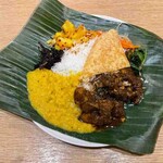 〆は「ブラックポークカレーセット」1,450円で。メニューにはセットとありますが、カレーをメインにさまざまな副菜がのるスリランカ式ワンプレートとなっています。