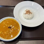 「チキンカレー」1,100円はココナッツの甘みとほのかな酸味を感じるマレーシアテイスト。写真はご飯少なめなので実際はもっとご飯の量があります。存在感のあるチキンとトロッとするまで火の入ったじゃがいもがご飯とよく合います。