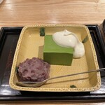 紀の善の看板メニューといえば「抹茶ババロア」。先代の女将さんが考案した人気の甘味で、なめらかな口溶けの抹茶ババロアに生クリームとつぶあんを添えた一皿です。濃厚な抹茶は甘すぎず上品な味わいに仕上がっています。