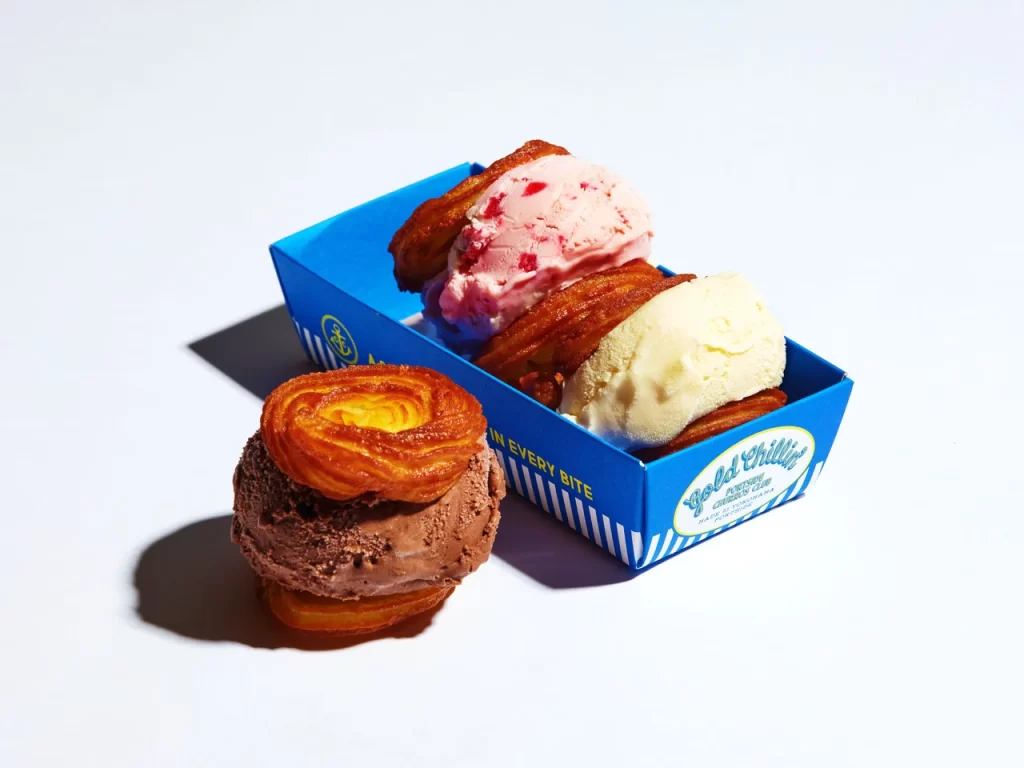 看板メニューの「Gold Chillin’(アイスチュロス)」1,300円は、齋藤さんがメキシコで出会ったスイーツがベース。カリッと揚げた丸いチュロス生地に、冷たいアイスをサンドした商品です。味はチョコレート・バニラ・ストロベリーの3種類で、一口ごとに驚きと満足感を届けてくれる、新感覚の味わいが楽しめます。