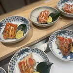 造り盛り合わせ。山形の本マグロ、和歌山のタチウオ、タコ、高知のシマアジ、千葉の金目鯛、クジラのさえずり、福岡のキスの昆布〆と盛りだくさん。「造りの種類も量も調整可能なので、お伝えください!」と稲田さん。