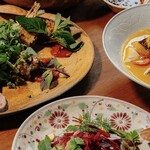 木製のアンティーク家具を中心にした店内は、上品なアジアンテイスト。大人数でも楽しめるテーブル席と、オープンキッチンのライブ感を堪能できるカウンター席があるので、1人でもグループでもどうぞ。料理はソースやディップのバリエーションが豊富で、楽しさを感じられます。メインデッシュのバクテーや炭火焼の鴨は3~4人前と記されていますが、2人前なども可能です。通常、エスニック系のお店は圧倒的に女性客が多いのですが、私が訪れた日は男性だけのグループなどもいて、新しい流れを感じました。
