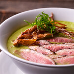 「鴨抹茶らぁ麺」1,500円は、クリーミーでコクのある鶏白湯スープに、上質な抹茶の繊細な香りを合わせたユニークな一杯。国産鴨ロースを自家製の柑橘麹タレに漬け込み、低温調理で仕上げた鴨チャーシューは、しっとりと柔らかく香ばしさも抜群。抹茶の風味とともに、奥行きのある味わいを楽しめます。