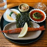 続いて運ばれてきたのは「前菜の盛り合わせ」。大きめの皿の上に「カンジャン・セウ」「クラゲの冷菜」「穴子のジョン」「ヤリイカのムルフェ」の4品が小皿に盛り付けられて登場する様子は、まるで和食の八寸のよう。