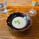 そんな「オンギ」の夏のコース(7,700円)は「コングクス」からスタートした。コングクスとは、直訳すれば豆(コン)麺(グクス)の意味。本来は、豆乳ベースの冷たいスープでいただく麺料理で、蒸した大豆を水と共にミキサーにかけたスープに素麺を入れたもの。動物系スープは使わず、味付けも塩のみというリーンな味わいが清涼感を呼ぶ夏にぴったりの一品は、韓国の夏の風物詩的存在といってもいいだろう。これをカンさんは先附にアレンジ。大豆にアーモンドを加えてコクを増した豆乳は、スープというよりソースのような濃厚さ。そこに素麺ならぬ豆腐麺を忍ばせ、ポーションもグッと小さくして提供。締めの食事的な立ち位置のコングクスが、洒落たスターターとしての逸品に変身。伝統の味を守りつつ、ちょっと視点を変えることで新感覚のテイストを表現する手腕もあっぱれだ。「オンギ」の持ち味の一つでもある。