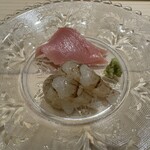 ほんのり温かいシャリには、水分が多すぎる新米を使わず、宮城の2~3年ものの古米を使用。丁寧な包丁仕事を入れた赤いか、遠洋で水揚げされたものから選び抜かれた甘海老、小さな20匹ほどで構成される甘くねっとりとした白海老など、小ぶりでふんわりとした、細部にまで趣向を凝らした握りは感動の連続。