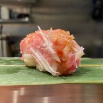 「おまかせにぎり」10貫 6,900円をはじめ、大ぶりな握りで高コスパとSNSでバズッている「鮨 はし本」。大将もサービス精神旺盛で、それも人気の秘訣のようです。