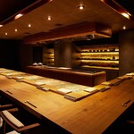 渋谷駅前の喧騒から一歩離れた元東急文化村界隈。表通りから一歩入った坂道の奥に潜む隠れ家的シチュエーションに、早くも胸が高鳴る。「わざわざこの店を目指して来ていただけるようにしたかったので、あえて駅から離れた立地を選びました」と店長の上野裕太さん。ずっしりと重い扉を開ければ、スタイリッシュな空間に引き込まれる。質感のある左官壁や楡の木のカウンター、そして、カウンター奥にはおくどさんまで設えた店内は、焼き鳥店というよりも高級割烹を思わせるシックな趣だ。