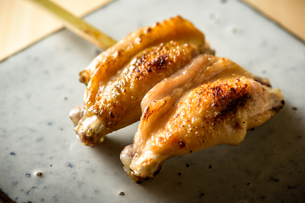 『手羽。濃厚で炭がしっかり効いており、特に骨の周りの肉について顕著だ。添えられたレモンをかけるとエスニック的なおいしさも出てきて、これも良い味変となる。