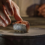 美しく飾り包丁を入れた鰊には生姜に唐辛子と醤油を合わせた紅葉生姜をトッピング。なまめかしいトロンとした鰊の脂を紅葉生姜がピリリと引き締め、解けた酢飯とともに喉を通るとじんわりと滋味深さが後を引きます。