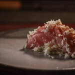 なんともそそられるビジュアルです。脂がのったとろとろの中トロの上から山わさびを削りかけています。山わさびがもたらす強い辛みが鮪の脂を程よく中和し、新しいおいしさが生まれます。