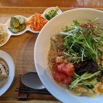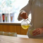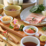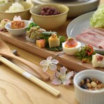 ごまをすりながら待っていると ・本日のおばんざい2品 ・ごまで楽しむお野菜のせいろ(ごま豆腐付き) ・玄米ごまご飯 ・精進おみそ汁 ・季節のフルーツが運ばれてきます。 ご自由にと製品のごま調味料もテーブルにいくつも置いてあり、良質なごまと力強い野菜が元気をくれます!