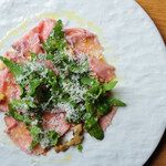 スペシャリテのオムレツトリュフやレモンバターパスタなど「メグリヴァ」のレシピを受け継いでいるとはいえ、そこに甘んじるというヤワさだけではない覚悟が、料理からもしっかりと感じることができる。たとえば奄美マザービーフの経産牛を使ったタリアータはオリジナルで提供する料理のひとつだが、強火で手早く表面を焼き固め、蒸気で加熱するヴァプールという技法を用いてしっとりと仕上げられており、こちらもワインがすいすいと進む。
