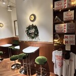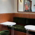 店舗は約150平方メートルの広さがあり、瓶詰めチーズケーキ「CHILK」をはじめとする製造拠点を備えつつ、ガラス越しにパティシエたちが働く姿を眺められるショップも併設。まるでドライブ途中に立ち寄ったロードサイドカフェのような雰囲気で、訪れる人にワクワクと安心感を与えてくれます。ヘリンボーンの床にはラワン材を用いるなど、経年変化を楽しめる素材を取り入れた空間に、大胆なウォールアートがアクセントを添えています。客席は9席と小規模ながら、特別な時間を演出します。