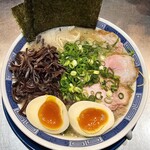 「ラーメン箕輪家」が、家系ではなく、塩豚骨ラーメンの提供を始めたと知って食べに行きました。「塩豚骨細麺(替え玉付き)」に、岩海苔と味玉をトッピング。 スープも麺もおいしくて、替え玉の時に岩海苔を大量トッピングすると塩味が強めになりますが、岩海苔と麺を絡めると味変されて、この食べ方も良かったです。この時はライスを頼みませんでしたが、この塩豚骨も間違いなくライスに合いますね。