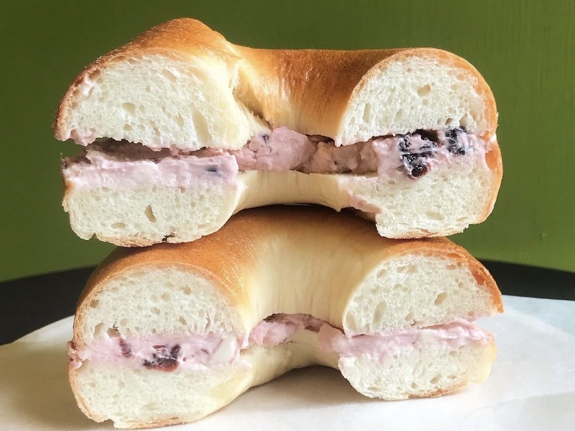 また、「ブルーベリークリームチーズサンド」600円も人気の一品。同店自慢のシンプルなプレーンベーグルに、自家製ブルーベリークリームチーズをたっぷりサンド。甘さ控えめで爽やかな味わいが広がり、ボリュームがありつつも食べやすいバランスに仕上がっています。大人から子供まで幅広い層におすすめできるベーグルです。