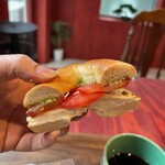 スモークサーモンベーグルサンドはサーモンと北海道産クリームチーズにオニオン、ケッパーの王道の組み合わせ。ベーグルは小ぶりながらもっちもちで食べ応えあって朝ごはんにぴったりでした。