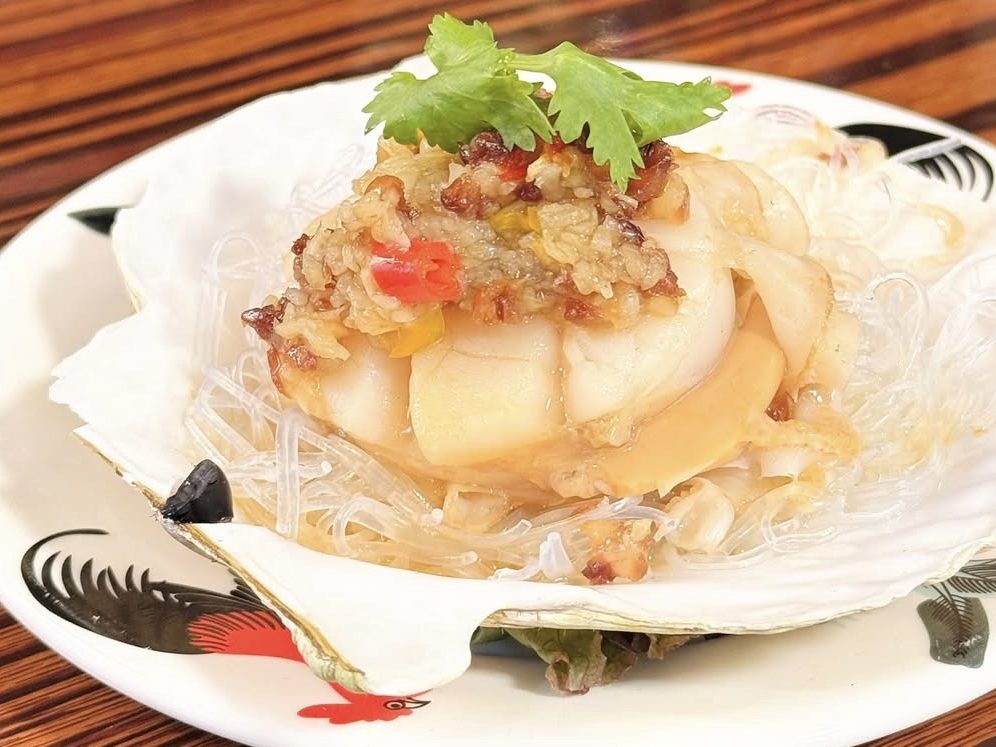 「蒜蓉粉絲蒸扇貝(にんにく春雨ホタテ)」1,500円は、大ぶりのホタテをふっくら蒸し上げ、刻みにんにくと特製ソースがたっぷり。下に敷いた春雨が旨味を吸い込み、見た目も華やか。お酒のアテにもぴったりです。