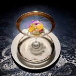 メニューは、全8~9品が出るおまかせ2.2万円のみ。そのコースは「御礼の花束」と名づけられた前菜からスタートする。その名の通り、ひまわりやオクラなどの江戸前ハーブやエディブルフラワーで飾られたグラスは、まさに食べる花束。グラスの底には、トマト水にわさびを合わせたジュレを忍ばせてあり、いわば、これがドレッシング代わり。爽やかな香りと食味は、コースのスターターにピッタリだ。