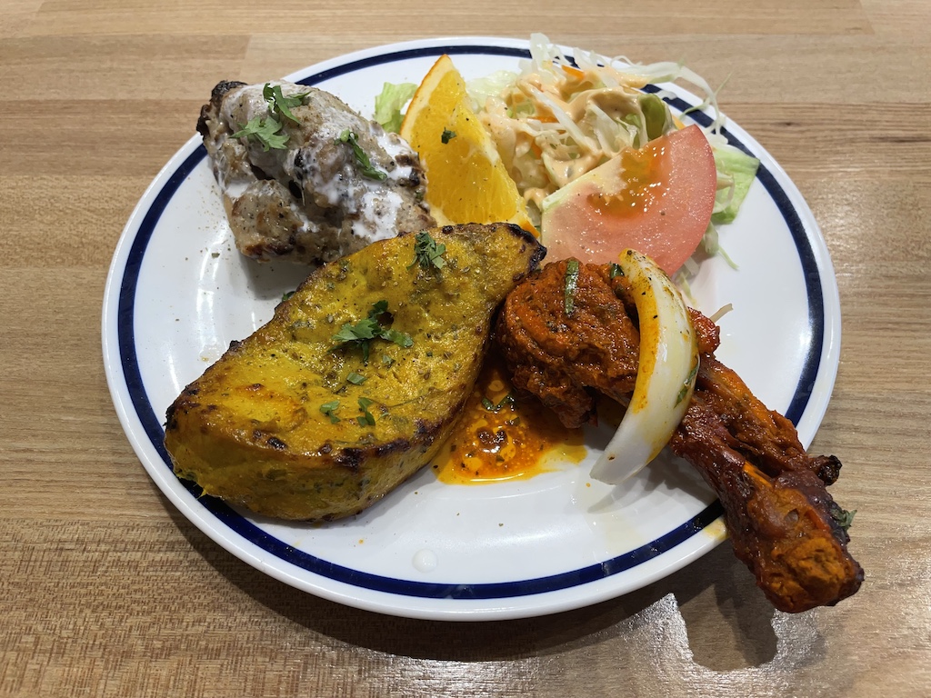 続いて焼き物。この日はタンドリーチキン、マライティッカ、フィッシュティッカの3種。マライティッカとはヨーグルトや生クリームなどに漬け込んだ骨なしチキンをタンドールで焼いたもの。フィッシュティッカはタンドリーチキンの魚版と言えばわかりやすいでしょうか。どれも程よくジューシーでリッチなテイスト。お酒と合わせても良さそうな前菜です。