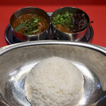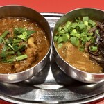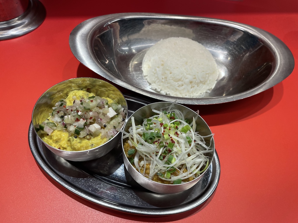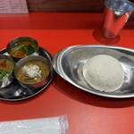 メインのカレーはビーフマサラ、ほうれん草チキン、ミックスシーフードを選択。こちらのお店はマトンのメニューがなく、かわりにビーフのメニューがあるというのが個性的。インドでは牛が神様なので牛肉を食べないのでは? と思う方もいるかもしれませんが、宗教によっては牛肉を食べる人も少なからずいて、特に南インドのケララ州では牛肉を使った名物料理もあるくらいです。