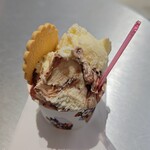 一番人気のミルクフレーバー「ブォンタレンティ」は、16世紀にジェラートを考案した人物の名を冠したお店のシグネチャー。そのミルク味にココアとヘーゼルナッツが入ったオリジナルソースを加えた、ロンドンのコンテスト受賞作「ブォンタレンティドルチェヴィータ」や季節限定フレーバーなど、常時7〜10種類が並び「メディオ(2フレーバー)」691円、「グランデ(3フレーバー)」756円の2種のカップから選べます。