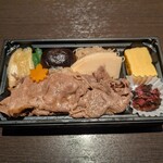 明治28年創業の老舗「人形町今半」では、お店自慢の弁当と惣菜を取りそろえています。看板メニューの「黒毛和牛すき焼き弁当」1,890円〜は、A4・A5ランクの厳選黒毛和牛の雌牛のみを秘伝の割下で炊き上げ、柔らかな肉の食感と深い味わいを堪能できる逸品。部位ごとに3種類の価格帯が用意されています。