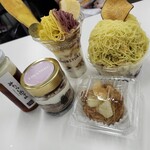 「ほっこり芋」では、石田農園が展開するブランドさつまいも「金蜜芋」(紅はるかのオリジナルブランド)を購入することができます。金蜜芋はなんと糖度70度越え。2年の歳月をかけて完成したお芋です。そんな金蜜芋を使って、さらにおいしく昇華させたスイーツメニューに注目! おすすめは2025年の冬と夏の「さつまいも博」にて、2期連続で「幸せのおすそ分け部門」1位に選ばれた「金蜜芋のバスクチーズケーキ」。こちらはイベント会期中も連日完売を誇った人気商品です。金蜜芋の焼き芋を敷き詰め、その上に芋ペースト、チーズケーキの三層仕立て。お芋とチーズケーキの絶妙なバランスが楽しめます。そして、しっとりとした芋ペーストを美しくまとった「お芋のモンブラン」。一番下には金蜜芋の焼き芋、その上にバニラアイスがのっています。他にも定番人気の「焼き芋クリームブリュレ」など、ほっこりする芋スイーツのラインアップです。