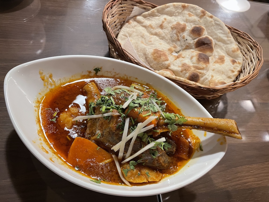 「子羊のすね肉カレーセット」2,000円はスルッと骨ばなれの良いラムのすね肉のうまみがグレイビーに行き渡った羊好きにはたまらないカレー。ニハリ(インドやパキスタン等で親しみの深いシチュー)を思い浮かべる方もいるかもしれませんが、ニハリよりシャープでエッジの利いたテイストとなっています。