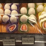 イチオシメニューは、店名にもある「いちご大福」390円〜。自家製のふわふわ求肥と白餡、甘酸っぱいいちごのマリアージュが楽しめます。使われるいちごは季節によって種類を変え、店頭には多い時で5〜6種類のいちご大福が並ぶそうです。