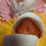 苺大福、本当にみずみずしくて美味しい!甘くて水分もあり、良い苺を使ってるんだなと感じました。小ぶりなのですぐ食べ終わってしまうのが悲しい。甘いけど甘すぎない白あん?も好みでした。苺がメインという感じでよかったです。