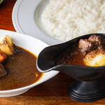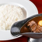 皿に盛り付けられたご飯とソースポットのカレー。ご馳走感ある佇まいの中にはゴロッと存在感のある大ぶりなビーフ角切りとポテト。ダブルだとそのビーフが2つ。シャバッとしたテクスチャのカレーはビターかつスパイシーな昔ながらのインド風カレーライスの趣。
