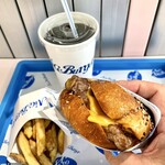 ハンバーガーに500円をプラスすると、サラダカップまたはフライドポテトと、ドリンクがつくセットに変更可能。単品注文よりお得です。