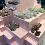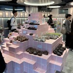 ブランドカラーのピンクでまとめた、大きなタイル貼りの陳列棚に並ぶのは、約40種類のドーナツ。眺めているだけでも気分が高揚してくる空間です。