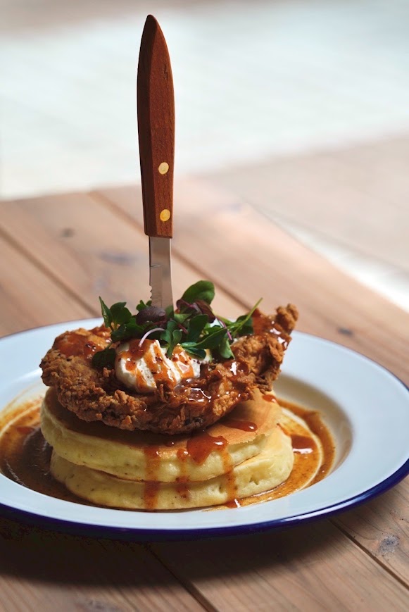 看板メニューの「PFC Tuck」2,180円は、サクサクのフライドチキンをふわふわのバターミルクパンケーキに重ねた一皿。デーツを使ったナチュラルな甘みのメープルシロップと、塩気のアクセントが絶妙なバランスを生んでいます。アメリカ南部の定番「チキン&ワッフル」を、Pebble流にカリフォルニアスタイルへと昇華させた人気メニューです。
